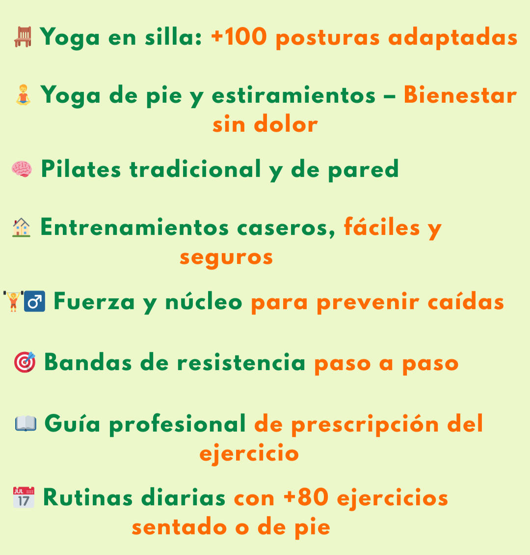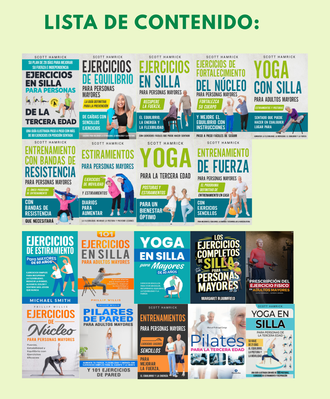 Una colección completa con más de 15 guías ilustradas, diseñadas para trabajar fuerza, equilibrio, flexibilidad y energía en personas mayores: