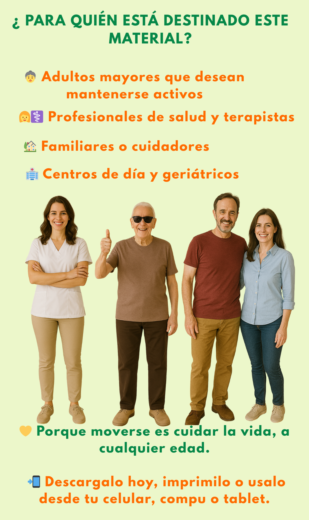 Está diseñado especialmente para adultos mayores, pero las rutinas y actividades pueden adaptarse a cualquier persona que quiera moverse de forma segura.